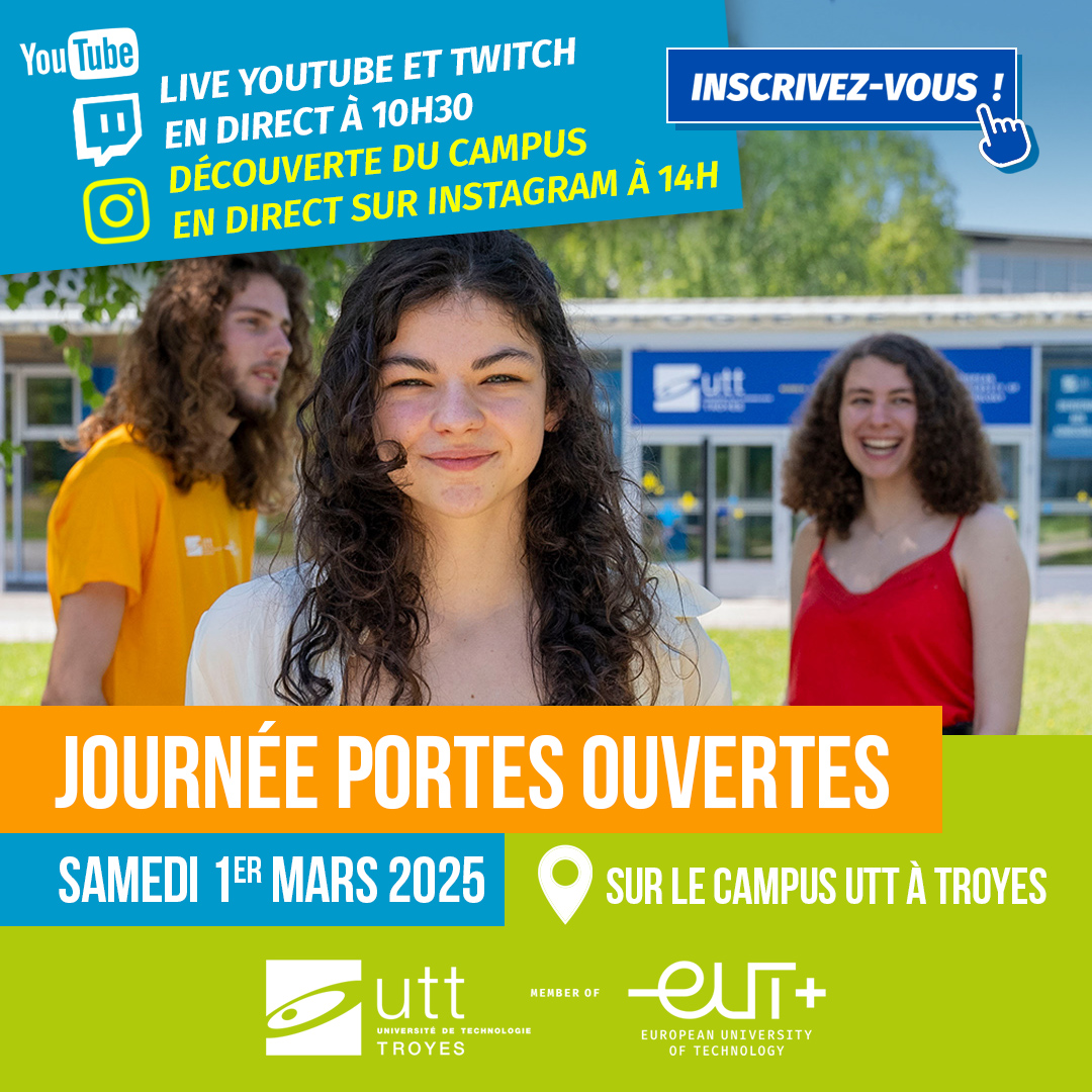 Université de Technologie de Troyes 12 rue Marie Curie, TROYESL’UTT vous ouvre ses portes ! Le samedi 1er mars 2025, l’Université de Technologie de Troyes ouvrira ses portes aux futurs bacheliers scientifiques, aux étudiants d’IUT, de BTS, de Licence et de classes préparatoires scientifiques ou lettres et sciences sociales Khâgnes B/L qui souhaitent découvrir les métiers d’ingénieur. Toutes les personnes intéressées par les spécialités de l’UTT pourront également se renseigner auprès de nos stands formation continue : Licence Professionnelle (LP), Diplôme Universitaire (DU), Validation des Acquis de l’Expérience (VAE).