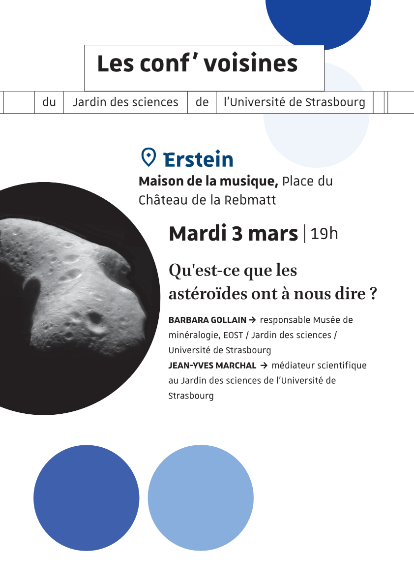 Qu’est-ce que les astéroïdes ont à nous dire ? 2 place du Château de la Rebmatt, Erstein, Grand Est, FranceQu’est-ce que les astéroïdes ont à nous dire ? Barbara GOLLAIN, responsable Musée de minéralogie, EOST / Jardin des sciences / Université de Strasbourg, et Jean-Yves MARCHAL, médiateur scientifique au Jardin des sciences de l’Université de Strasbourg En moyenne, plus de 2000 articles numériques paraissent tous les mois sur le sujet, considérant trop souvent ces astéroïdes comme menaces potentielles pour notre planète Terre. Depuis le début du 19ème siècle, nous les observons puis les explorons, permettant ainsi d’accroître nos connaissances sur ces corps du Système Solaire. Âgés de plusieurs milliards d’années, météorites et astéroïdes se dévoilent grâce aux progrès scientifiques et techniques, et attisent les convoitises.