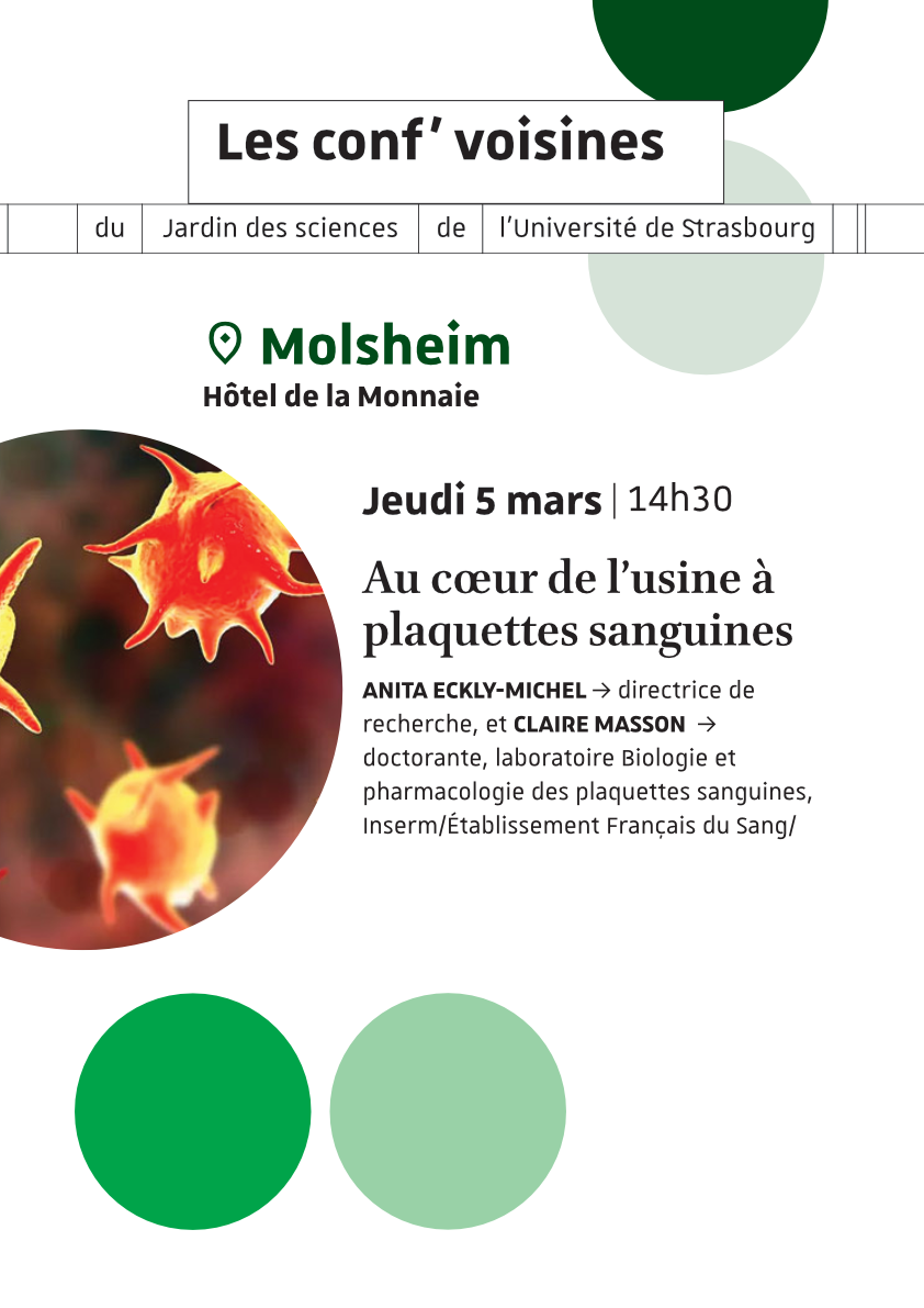 Au cœur de l’usine à plaquettes sanguines 6, rue de la monnaie, Molsheim, Grand Est, FranceAu cœur de l’usine à plaquettes sanguines. Anita ECKLY-MICHEL, directrice de recherche, et Claire MASSON, doctorante, laboratoire Biologie et pharmacologie des plaquettes sanguines, Inserm/Établissement Français du Sang/Université de Strasbourg Au microscope, un monde invisible se révèle : celui des cellules du sang. Dans notre laboratoire, nous explorons comment ces minuscules ouvrières se développent et participent à la protection de notre organisme. Grâce à des images en trois dimensions d’une précision remarquable, plongez au cœur de la moelle osseuse et découvrez les mécanismes secrets de la formation des plaquettes, sources essentielles de notre santé.
