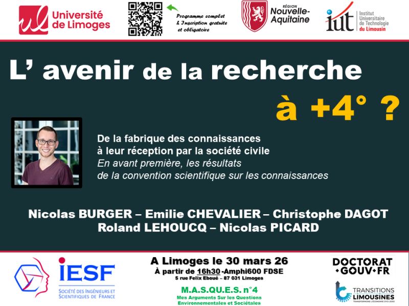 Quel est l'avenir de la recherche à +4° ? Explorez ce sujet à travers les travaux de la Convention Scientifique sur les connaissances à l'Université de Limoges lundi 30 mars aux côtés d'Emilie Chevalier, participante de la Convention. Sciences ouvertes et participatives, financements et coûts des projets et des actions de recherche, médiation et liens [...]