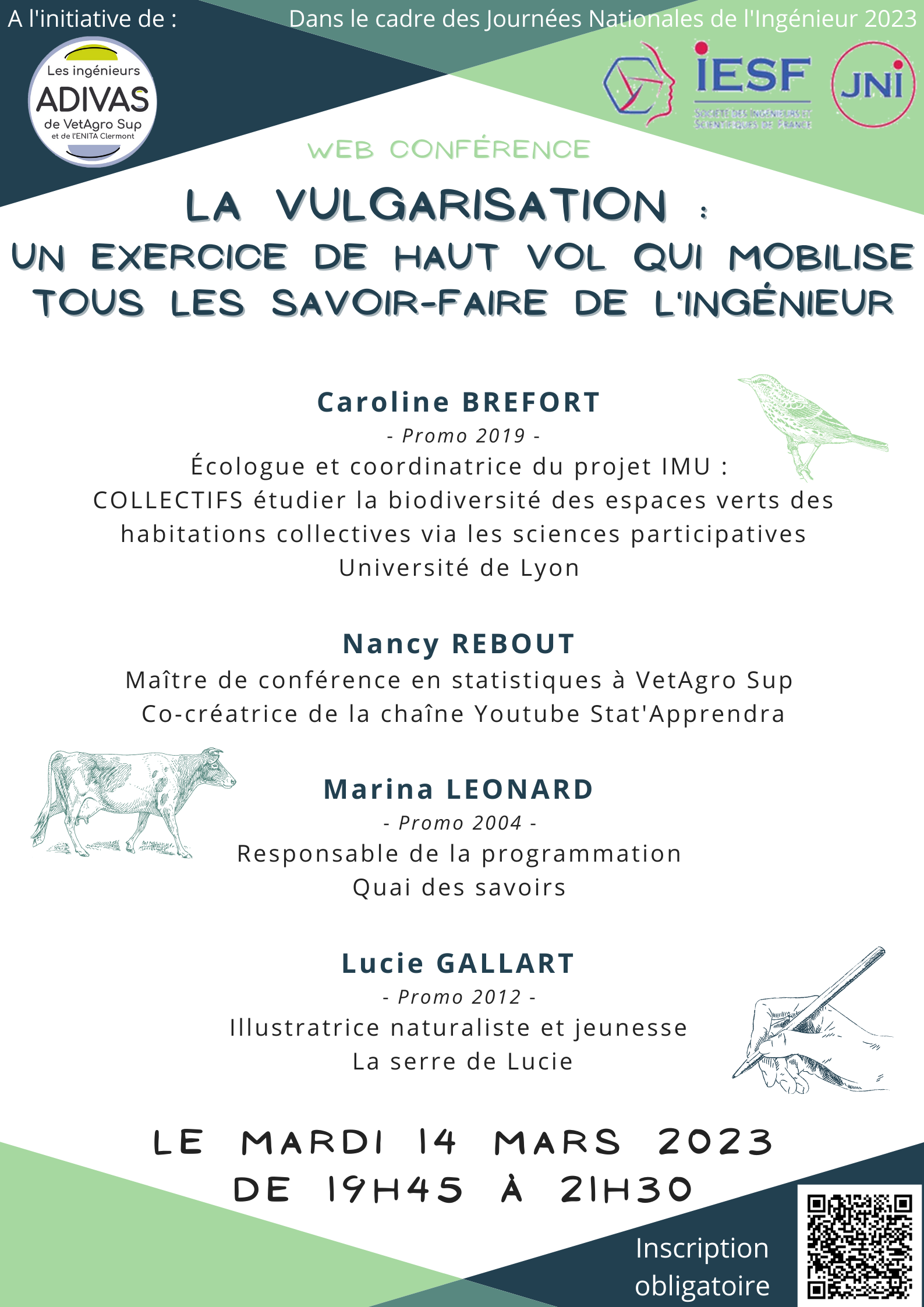 ADIVAS : l'association du réseaux des diplômés ingénieurs de VetAgro Sup et de l'ENITA de Clermont-ferrand organise dans le cadres des Journées Nationales de l'ingénieur un webinaire le dimanche 17 mars à 20h sur le thème : L'ingénieur agronome et l´Europe De paysan boulanger à gestionnaire de fonds européens, les métiers de l´ingénieur agronome sont impactés par les textes européens. Dans le cadre de notre table ronde, venez à la rencontre de ces professionnels qui vous feront découvrir leurs liens aux textes européens, et comment ceux-ci participent à modeler leurs missions au niveau national.