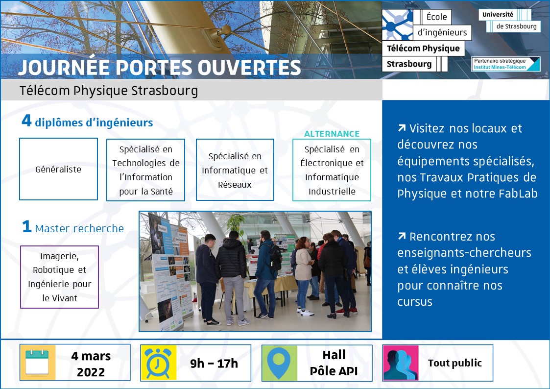 TELECOM PHYSIQUE STRASBOURG 300 Boulevard Sébastien Brant - Pôle API, Illkirch-Graffenstaden, Grand-Est, FranceChaque année, Télécom Physique Strasbourg organise le Forum École Entreprises qui marque une étape clé dans le parcours de nos élèves ingénieurs 1A et 2A. Organisé sur une journée, il s'articule autour d'une conférence, en matinée, sur une problématique relative aux futures responsabilités inhérentes au métier de l'ingénieur suivie l'après-midi de mini-ateliers collaboratifs et dynamiques favorisant des espaces d'échanges. Les représentants des entreprises, souvent d'anciens élèves de l'école, répondent aux questions et apportent des conseils sur les différentes facettes du métier d'ingénieur : les domaines d’activité, les métiers proposés, les missions et responsabilités, les opportunités de carrières, la politique de stage et de recrutement, mais aussi la vie et la culture d’entreprise...